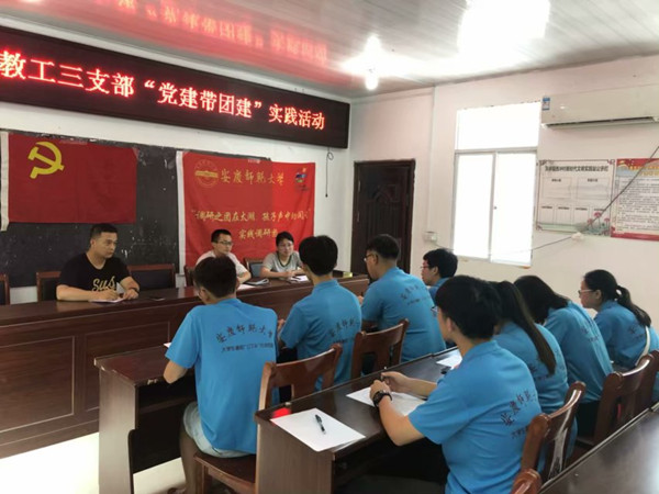 为深入学习贯彻习近平新时代中国特色社会主义思想,增强青年大学生的责任感和使命感,引导青年大学生在社会实践中受教育、长才干、做贡献,近日,bat365中文官方网站教工第三党支部组织大学生志愿者团队前往太湖县西冲村开展“不忘初心跟党走 牢记使命勇担当”主题“党建带团建”暑期社会实践活动。