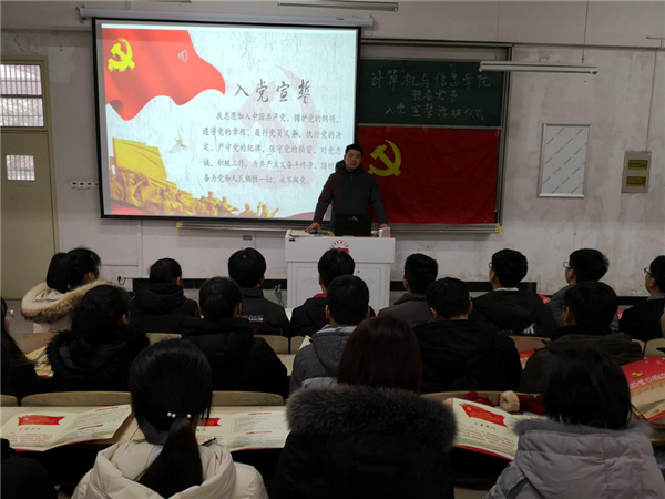 仪式在庄严的国际歌声中拉开帷幕,江伟宣读了bat365中文官方网站党委关于批准发展预备党员的文件,并代表学院党委对本次新发展的党员表示热烈祝贺,并为新党员代表发放政治生日提醒卡。他指出党员有两个重要的生日:第一是自然生日;第二是政治生日,即入党日。他对全体新党员提出了四点要求:一是要注重党性修养,增强党员意识;二是要充分发挥党员先锋模范作用,争做群众表率;三是要加强学习,特别是党建知识学习,在学习中提升自己的境界;四是在享有党员权利的同时要切实履行党员各项义务。