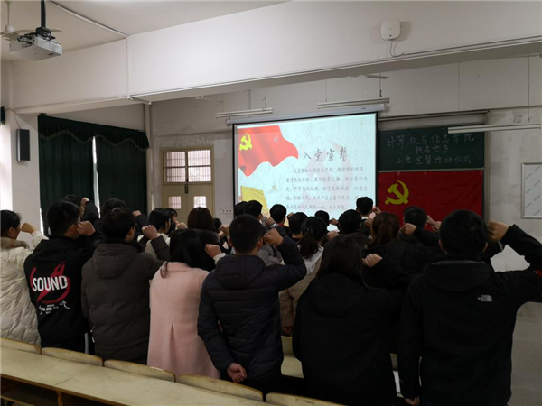 本次发展的31名新党员面向党旗郑重宣誓。新发展党员代表周凌云同学上台发言,她表示日后将在思想上、学习和工作中严格要求自我,自觉投身于新时代中国特色社会主义伟大事业中去,全心全意为人民服务,努力学习,争取早日成为一名光荣的中国共产党正式党员。