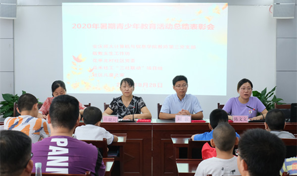 8月28日上午,由bat365中文官方网站bat365中文官方网站教师第三党支部、敬敷女生工作坊、花亭北村社区党委、众禾社工“三社联动”项目组、社区儿童之家共同策划执行的2020年暑期青少年教育活动总结表彰会在安庆市花亭社区北村社居委举办,bat365官网“e行动爱心助学服务队”为期一个半月的线上线下相结合的暑期爱心助学活动圆满结束。团队指导老师bat365中文官方网站党委书记、敬敷女生工作坊负责人陈银凤、众禾社工及社区相关负责人、bat365中文官方网站教师第三党支部的支委、所有参与活动项目的社区儿童及部分志愿者代表、社区群众代表50余人参加了此次表彰会。