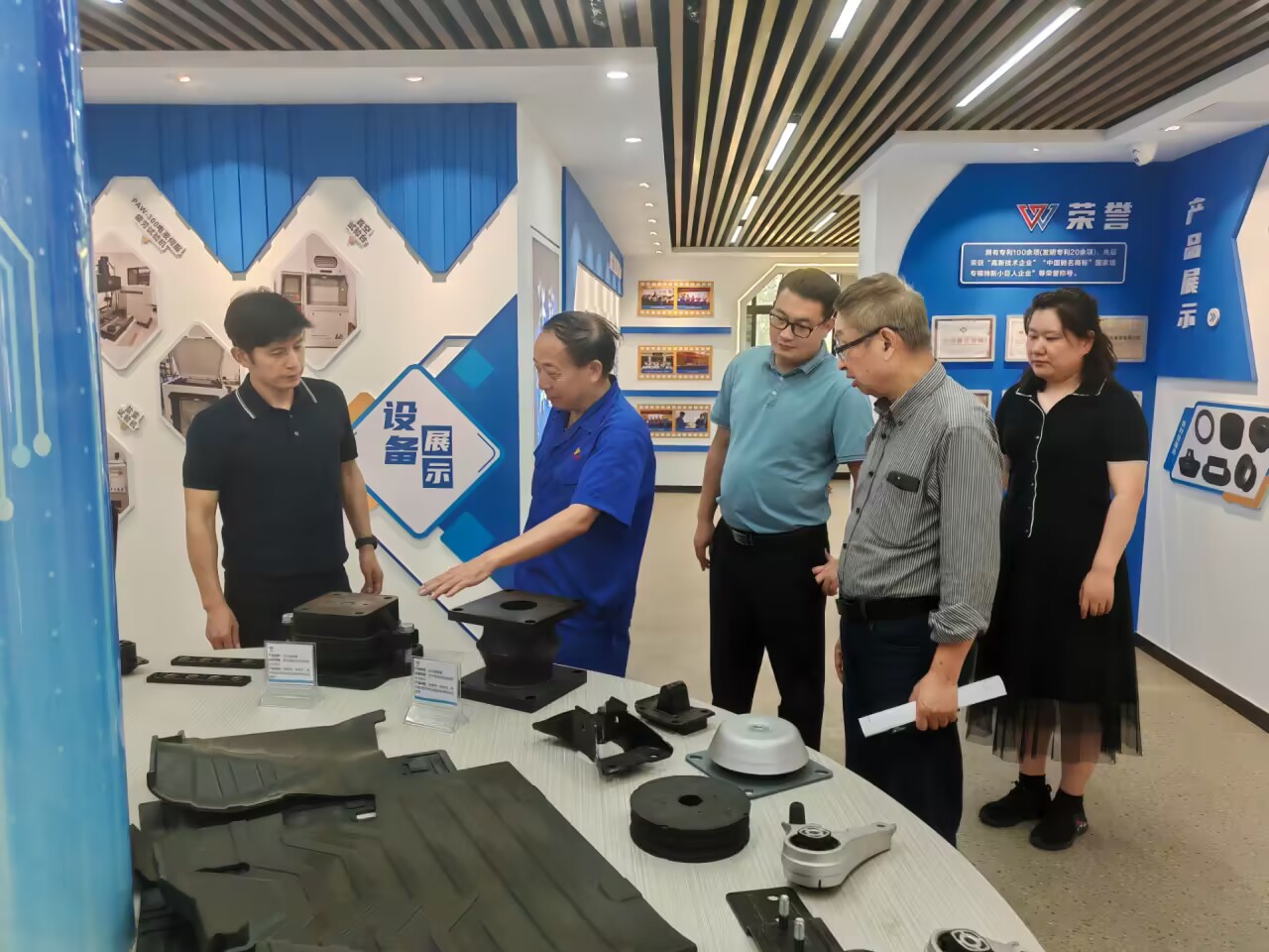 在微威集团相关负责人的陪同下,王远志一行首先参观了公司的产品展示厅、生产车间及研发中心。整洁高效的自动化生产线、严格的质量控制流程,特别是企业在橡胶减震制品领域的深厚积累与创新成果,给博士团队留下了深刻印象。参观过程中,团队成员积极提问,就智能传感在生产线上的应用、产品质量的机器视觉检测、生产数据的实时采集与分析等具体技术问题与企业工程师进行了深入探讨,现场气氛热烈。