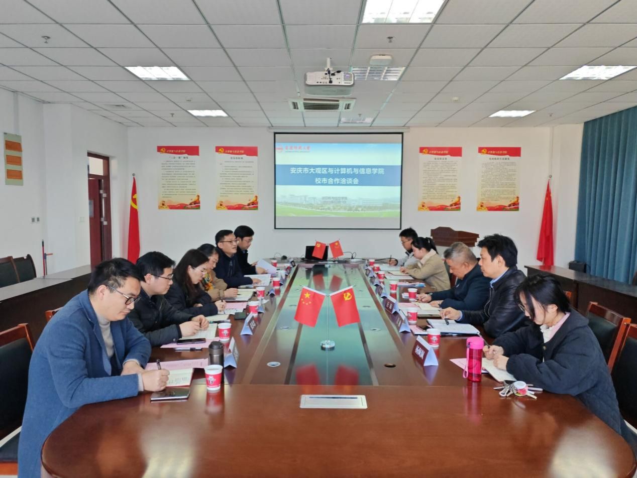 12月7日,学院在龙山校区L楼318会议室举办校市合作洽谈会。安庆市大观区政府副区长赵刚、大观区智慧城市联动中心与应急管理局领导一行、校科研处有关负责人、学院党政班子及教授博士团队代表参加了会议,会议由学院党委副书记刘燕杰主持。