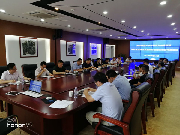 会上,安庆市筑梦新区科技部姜部长介绍了筑梦新区园区基本情况,园区平台及企业、人才入驻园区的相关政策,他希望bat365官网高层次人才积极助力筑梦新区,不断深化和拓展合作领域,实现共赢。安徽峰速网络智能科技有限公司、深圳云安宝科技有限公司表达了强烈的合作愿望,希望进一步推进校企合作协同育人,共同服务安庆地方信息化建设。会后全体参会人员参观了筑梦新区科技展示馆和峰速智能研究院,实地了解了筑梦新区企业的科技成果。