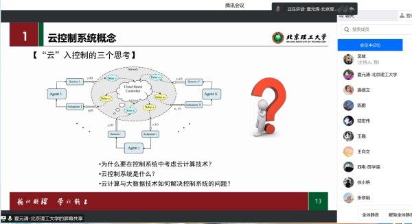 夏元清教授分别就云控制系统的产生背景、关键科学问题、最新研究进展及所面临的挑战等方面作了介绍。他指出,传统的控制技术难以满足高品质和实时控制的要求,为此,云控制系统(Cloud Control Systems,CCSs)的概念被创造性地提出,控制的实时性因为云计算的引入得到了保证。通过各种传感器感知汇聚而成的海量数据储存在云端,在云端利用人工智能等智能算法,实现系统的在线辨识与建模,结合模型预测控制、数据驱动控制、云网边端协同控制等先进控制方法实现系统的自主智能控制。报告会后,bat365官网多位教师和同学就实验环境选择和边缘计算等内容与夏教授进行了深入交流,同学们都表示受益匪浅。
