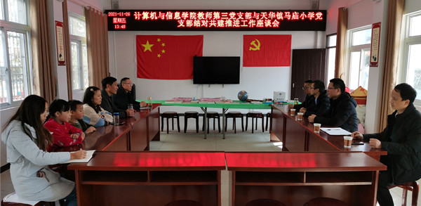 在天华镇马庙小学,江晋剑一行与马庙小学党支部召开了党支部结对共建推进工作座谈会。会上,双方介绍了近一年来党支部建设的主要措施和取得的成绩,并就下一步如何加强支部结对共建和帮扶举措进行了深入探讨。党支部副书记张友志代表教师第三党支部向马庙小学帮扶学生代表赠送了学习用品,并向学院援建的爱心图书角捐赠了图书和文体用品。会后,江晋剑为马庙小学五年级同学作了一场题为“新媒体与少儿阅读素养”的科普讲座,教导孩子们要用好网络和新媒体,养成良好的上网习惯,运用新媒体提升自己的阅读素养。