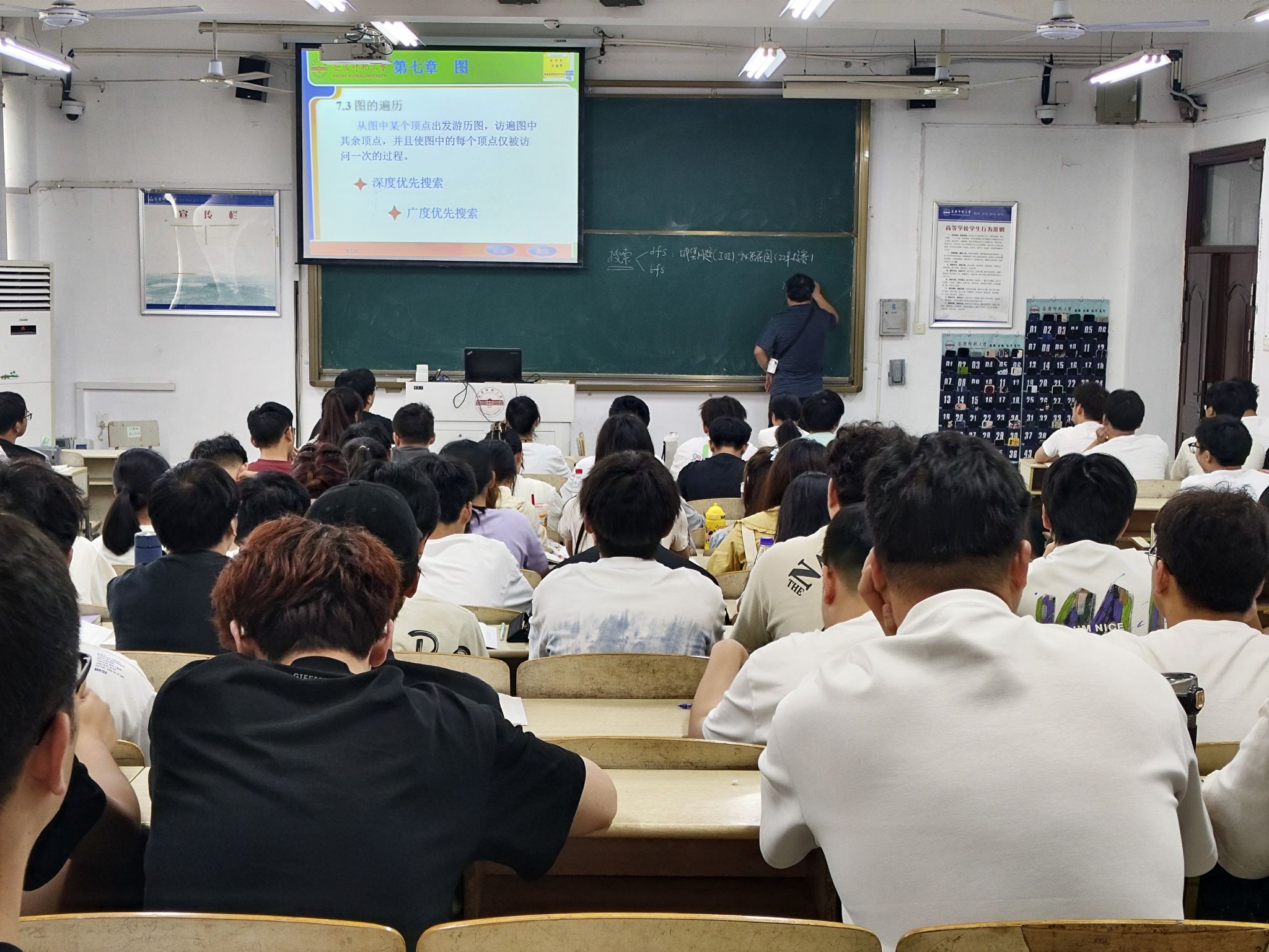 5月20日下午,教研室江克勤老师在B503教室开展了一堂《算法设计与分析》课程的教学公开课,教研室各位教师参与了此次观摩活动。江老师首先对期中考试结果进行了分析,重点讨论了贪心算法的应用与学生的解题表现。随后,江老师引出本次课的主题——图的遍历,并结合竞赛试题进行了详细讲解。在教学过程中,江老师采用动画展示了算法的执行过程,使得抽象的算法变得直观易懂,极大地调动了学生的学习积极性。课堂上,江老师思路清晰,讲解深入浅出,课堂氛围活跃,学生们积极参与讨论互动。课后,参与观摩的各位教师进行了点评和交流。大家一致认为,这堂课教学设计合理,内容讲解透彻,特别是在算法动画演示方面为学生们提供了清晰的学习路径和思维方法。