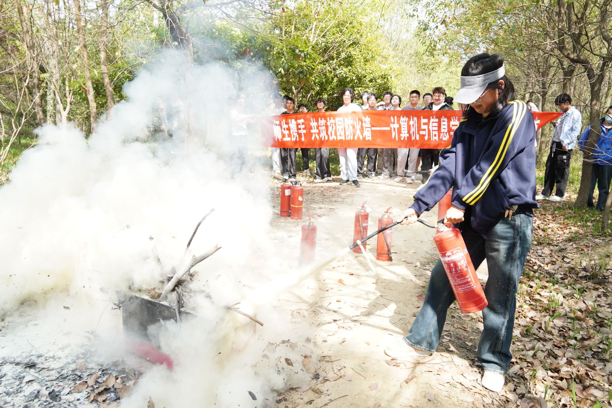 本次活动邀请了校安全管理处相关科室负责人在L302教室为师生代表带来了一场生动的应急消防知识宣讲。宣讲人结合近年火灾典型案例,详细剖析了火灾成因与预防要点,讲解了火场逃生技巧,并现场演示了消防面罩的正确佩戴方法。通过沉侵式互动学习,师生们不仅掌握了火灾预防与初期扑救的实用技能,更深刻地认识到消防安全的重要性。随后,疏散演练正式启动,全体师生迅速响应,在引导人员的指挥下,沿着疏散指示标志快速、有序地抵达bat365中文官方网站楼南广场的安全区域。疏散演练结束后,安全管理处工作人员引导师生来到指定场地,现场演示了灭火器、灭火毯、消防水枪的正确使用方法,并指导师生分批进行实操体验。在专业指导下,师生们按照“一提、二拔、三握、四压”的标准动作,手持灭火器迅速扑灭模拟火源,进一步巩固了所学的消防技能。