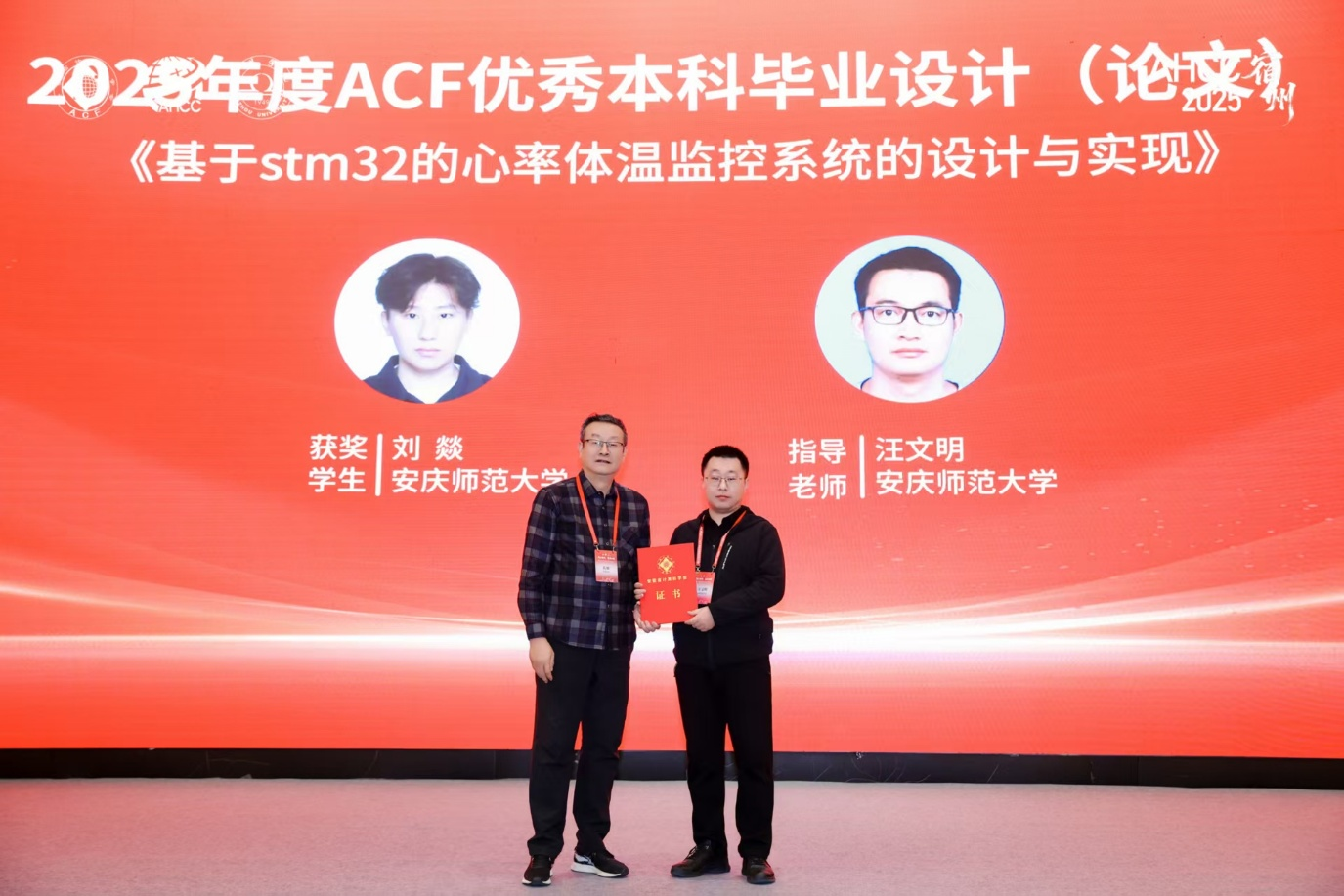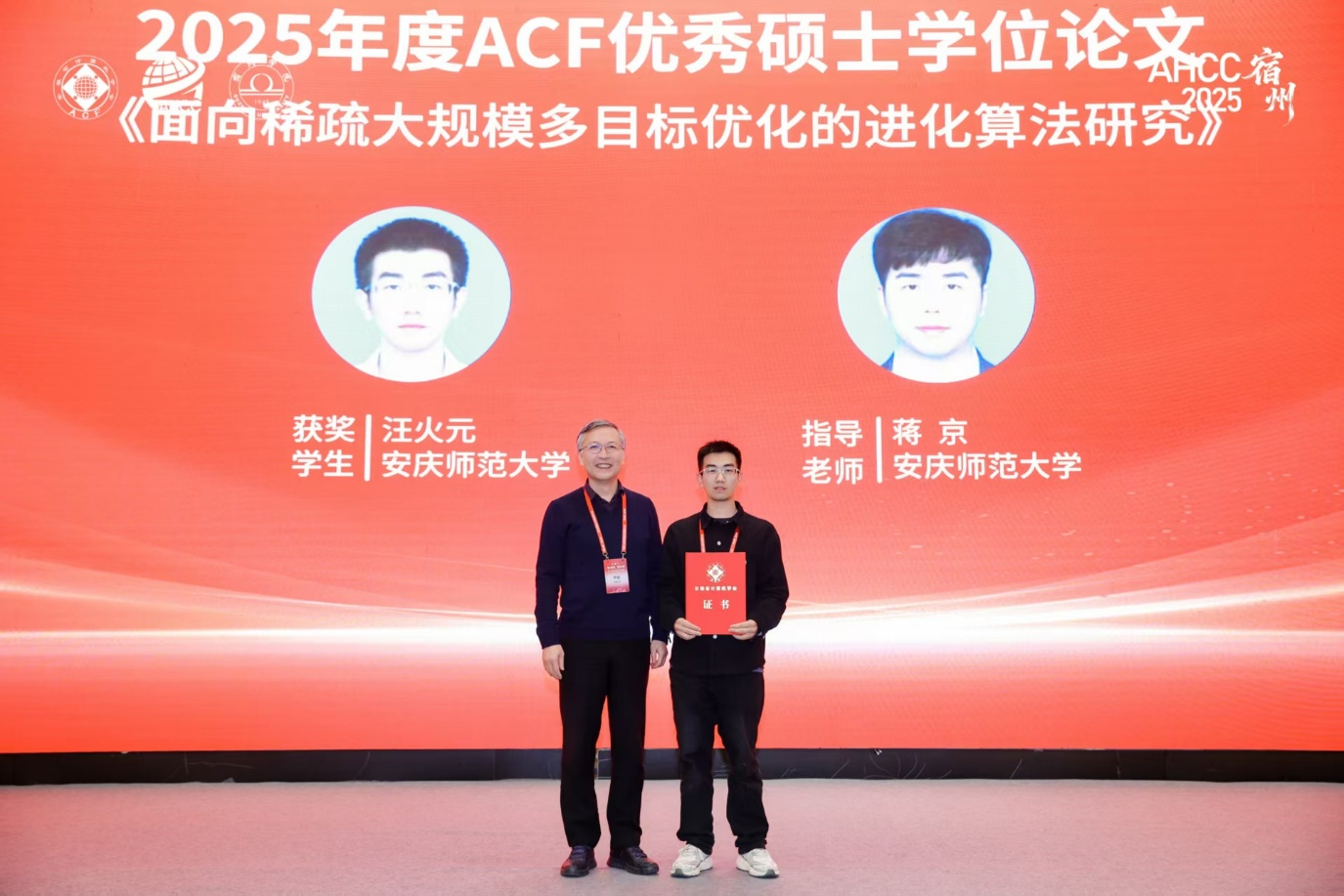 本届大会的优秀学位论文评选环节中,bat365官网取得了喜人的成绩。蒋京副教授指导硕士生汪火元完成的《面向稀疏大规模多目标优化的进化算法研究》荣获“2025年度ACF优秀硕士学位论文”奖;汪文明副教授指导本科生刘燚完成的《基于STM32的心率体温监控系统的设计与实现》荣获“2025年度ACF优秀本科毕业设计(论文)”奖。上述荣誉充分体现了bat365官网在教学质量提升和人才培养方面的良好成效,进一步激发了师生在科研创新与实践探索中的积极性与创造力。