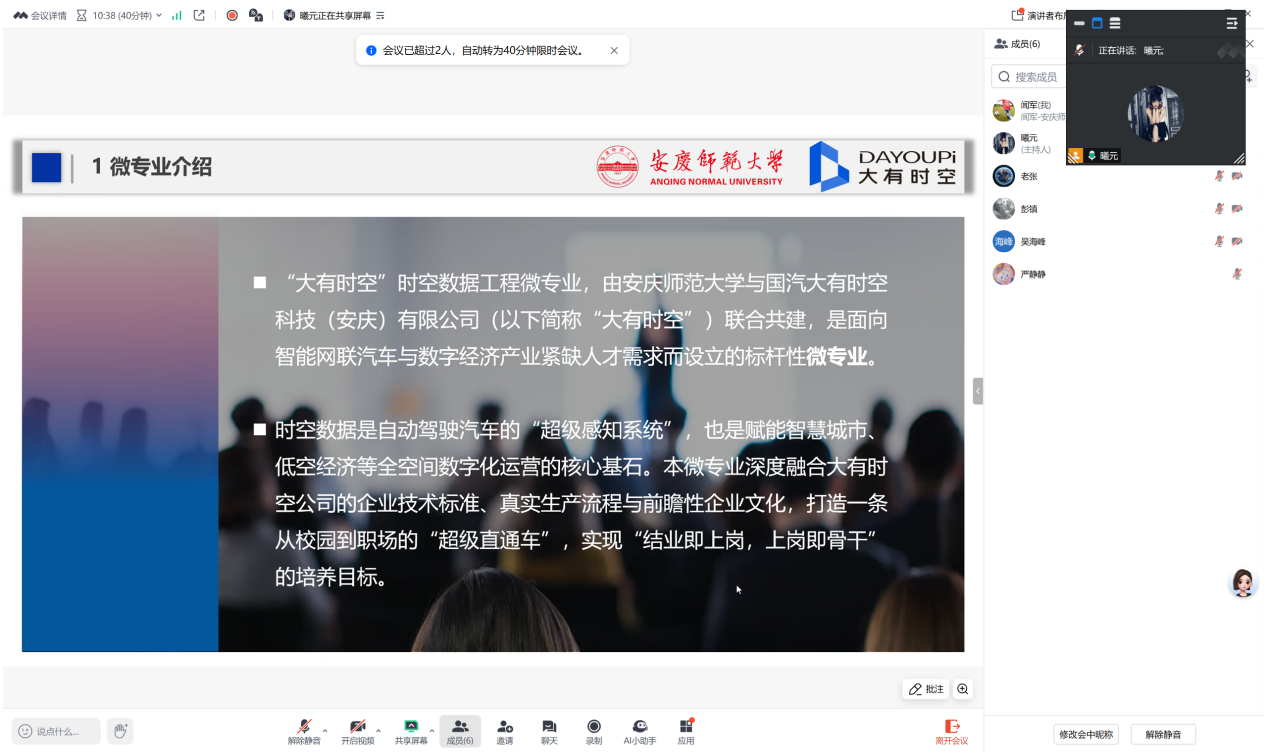 本次会议的召开,标志着“大有时空”时空数据工程微专业建设进入实施阶段,进一步明确了建设方向、细化了工作任务。下一步,bat365中文官方网站将持续深化产教融合、协同育人机制,着力打造具有示范意义的“人工智能+”微专业群,不断提升人才培养质量,为区域智能网联汽车、数字经济等相关产业高质量发展输送更多高素质技术技能人才。(撰稿:张曦元 审核:吴海峰)