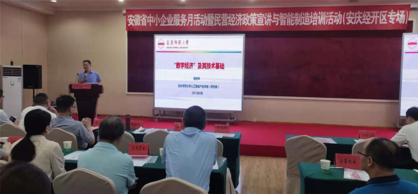 为了有力推进校市合作,6月30日,应安庆市经开区经济发展局邀请,人工智能产业学院(研究院)院长刘奎带领教授博士一行参加了安徽省中小企业服务月活动(安庆经开区专场),为经开区100多家工业企业开展了数字经济的专题宣讲与培训,现场为相关企业提供技术咨询,并应相关企业的需求做好后续的工作对接。
