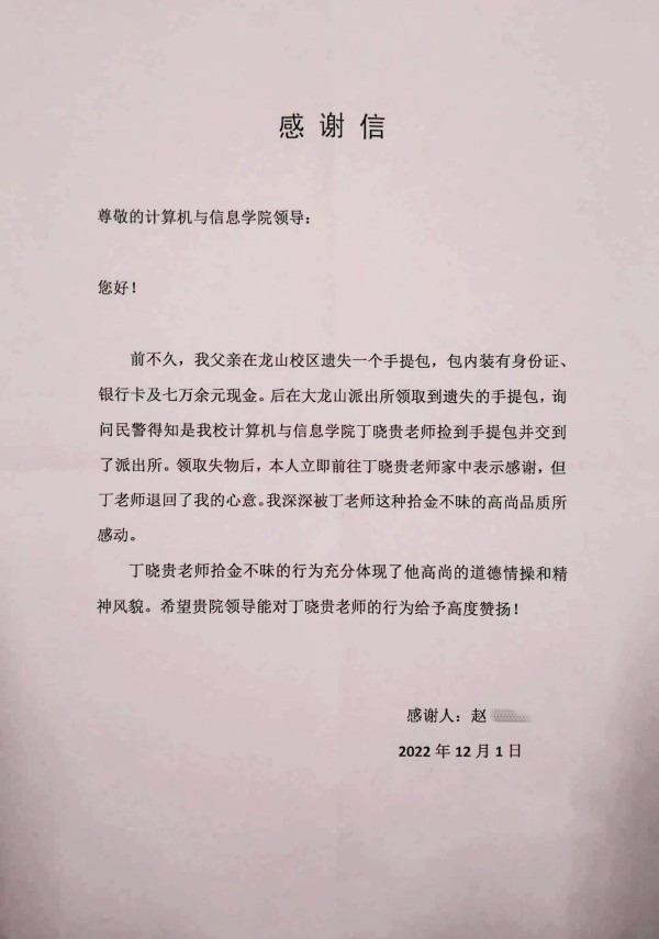 “我深深被丁老师这种拾金不昧的高尚品质所感动,希望贵院能对其行为给予高度赞扬。”近日,一封特别的信件被送到了bat365官网。原来是bat365官网丁晓贵老师拾金不昧,成功让失主一家找回丢失的七万余元现金及重要证件,失主家人为表达真挚的谢意,亲自送来了一封感谢信。