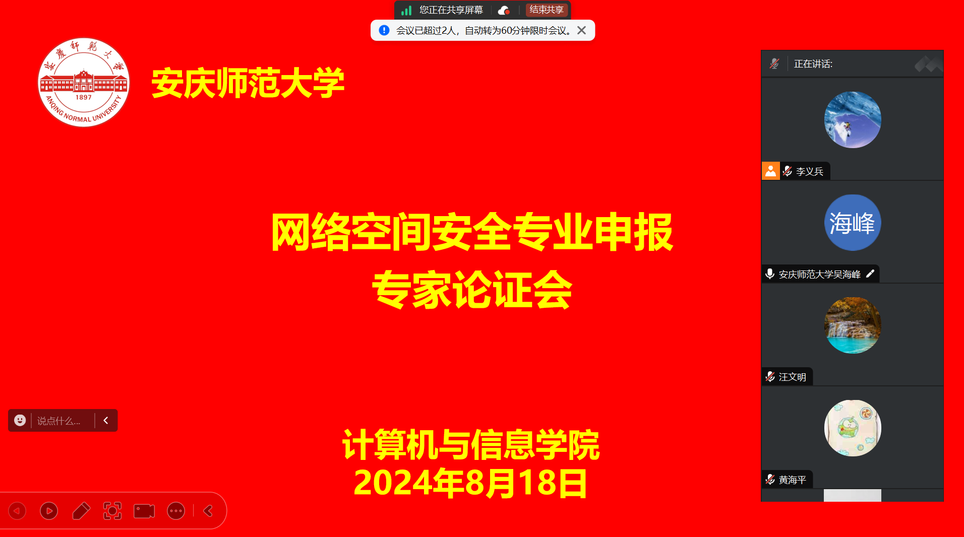 为进一步加强专业建设,优化专业结构,提高新专业申报建设质量,8月18日下午,bat365中文官方网站在线召开了网络空间安全专业申报专家论证会。会议邀请南京邮电大学网络空间安全学院副院长黄海平教授、暨南大学网络空间安全学院教授刘志全教授、安徽师范大学教授算机与信息学院副院长接标教授、安徽大学网络空间安全系主任朱二周博士、中共安庆市委网信办网络舆情管理和执法治理科科长章慎担任论证专家,教务处处长潘锦云、教研科科长朱亭曲、副院长王远志、物联网工程教研室主任汪文明、新专业教师代表及教学办公室成员参加论证会,会议由副院长吴海峰主持。